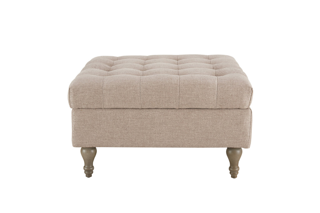 Abbott Button Top Storage Ottoman in Blue combines style and functionality with its elegant tufted design and practical storage space. Featuring turned wooden legs, this ottoman adds a touch of sophistication to any room while providing a convenient place to store your essentials.