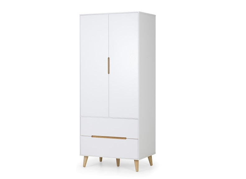 A stylish, retro-inspired wide chest with six drawers in an immaculate matt white lacquered finish, with complementary tapered oak finish legs and recessed handles to provide easy opening. The sleek Scandinavian feel of The Alicia Combination Wardrobe fits beautifully with any décor.