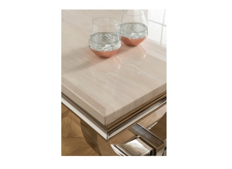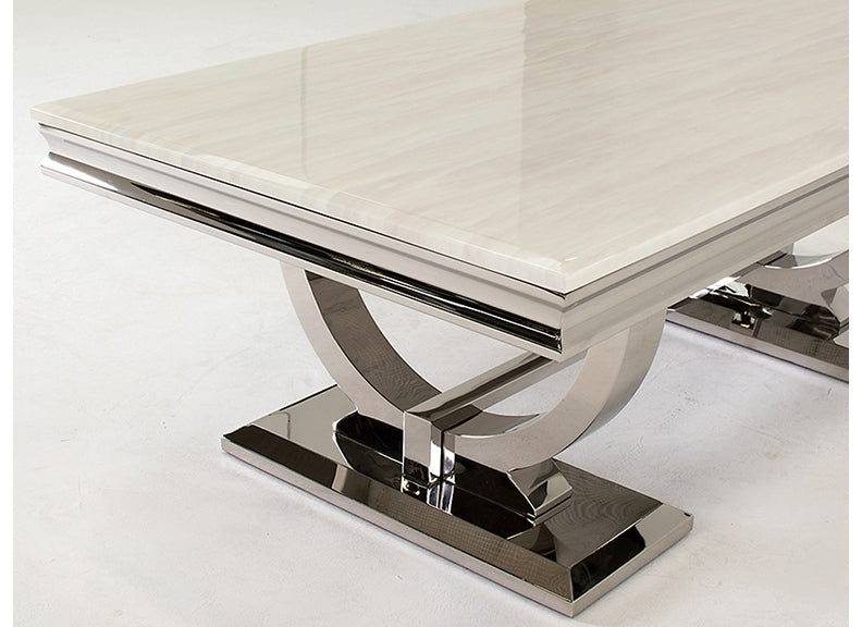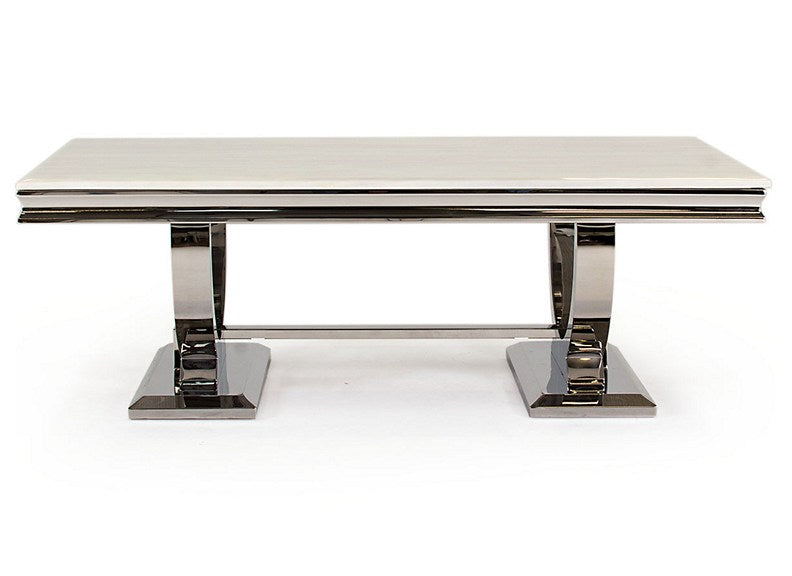 The Arianna Cream Coffee Table has a cream coloured marble top with a polished steel base.