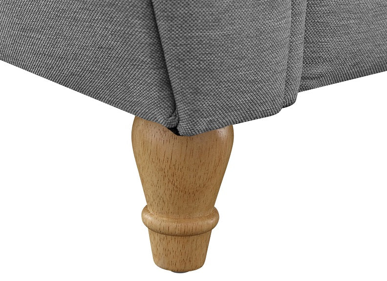 The Arizona Fabric Bed in medium grey with curved head & foot, turned wooden legs & buttonback fabric upholstered headboard.