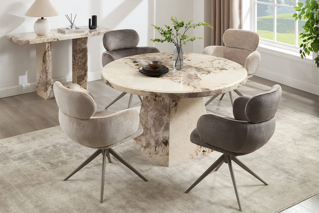 <p>Artemis Round Dining Table in Mottled Mocha combines modern design with practical durability. Crafted from solid marble and marble foil with a high-gloss finish, this table is UV resistant, easy to clean, and built to withstand everyday use. The tabletop features elegant miter edging, enhancing its sleek, contemporary look. With its rich mottled mocha tone, the Artemis Round Dining Table is a stylish centrepiece for any dining space.</p>