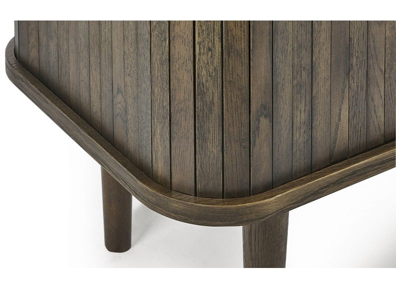 The Arya furniture items are largely made from wood board, plywood and dark lacquered oak/oak veneers, these items feature tambour sliding doors effectively hiding the furniture's interior.