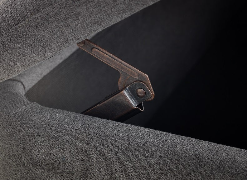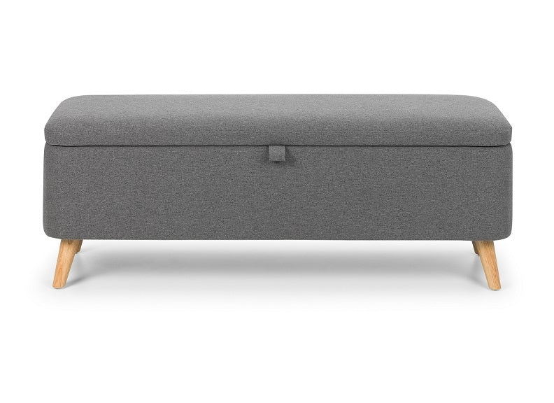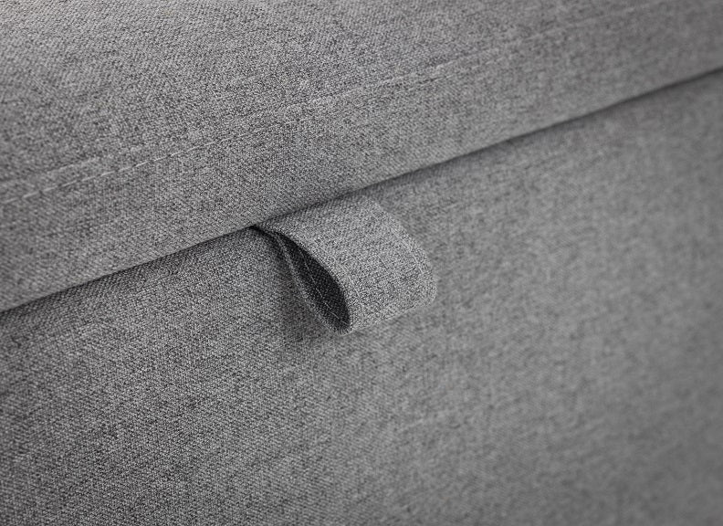 The Astrid Blanket Box with grey button back linen effect upholstery, perfectly proportioned to match the The Asrid Fabric Bed. This item has a hinged lid & light oak legs, perfect for storing bedding etc.