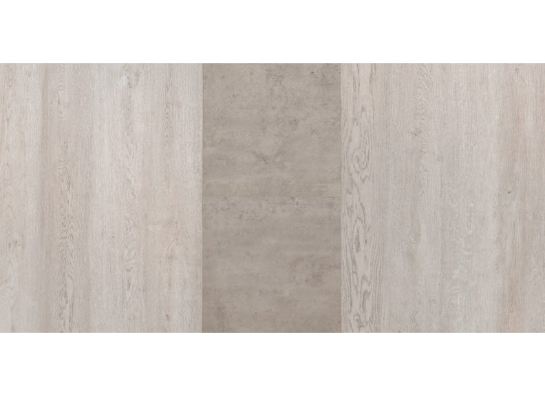 The Avery Extending Rectangular Dining Table, with greyed oak top and concrete effect wood board extension & black metal angular legs.