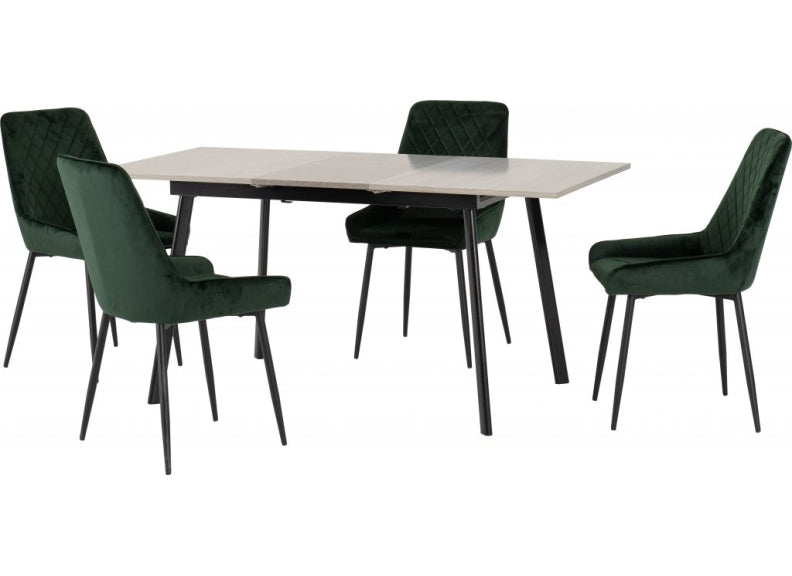 Includes an Avery rectangular extending dining table, with greyed oak top and concrete effect wood board extension & black metal angular legs and four velvet upholstered Avery Dining Chairs also with black metal legs.