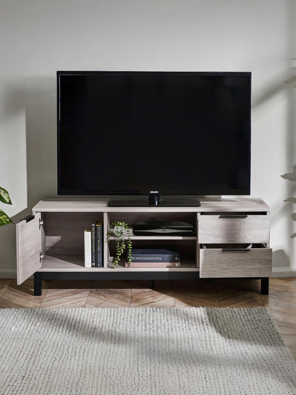 Discover the seamless blend of style and simplicity with the Bali TV Unit in Grey Oak. Crafted using revolutionary click furniture technology, this unit seamlessly combines high-quality craftsmanship with effortless assembly. The modern grey oak finish, complemented by contrasting black legs and handles, brings a classic industrial aesthetic to your living room. Featuring a spacious cupboard and two pull-out drawers for organised storage, along with center shelving for additional storage and display options.
