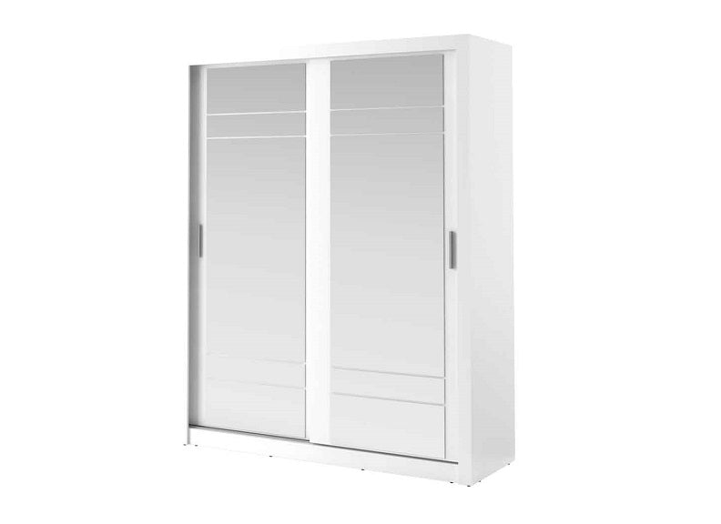 The Boston 2 m Sliding Door Wardrobe with two mirrored doors, includes a hanging area and a variety of internal shelves on the left & overhead. A chic stylish wardrobe that will look perfect in your bedroom.