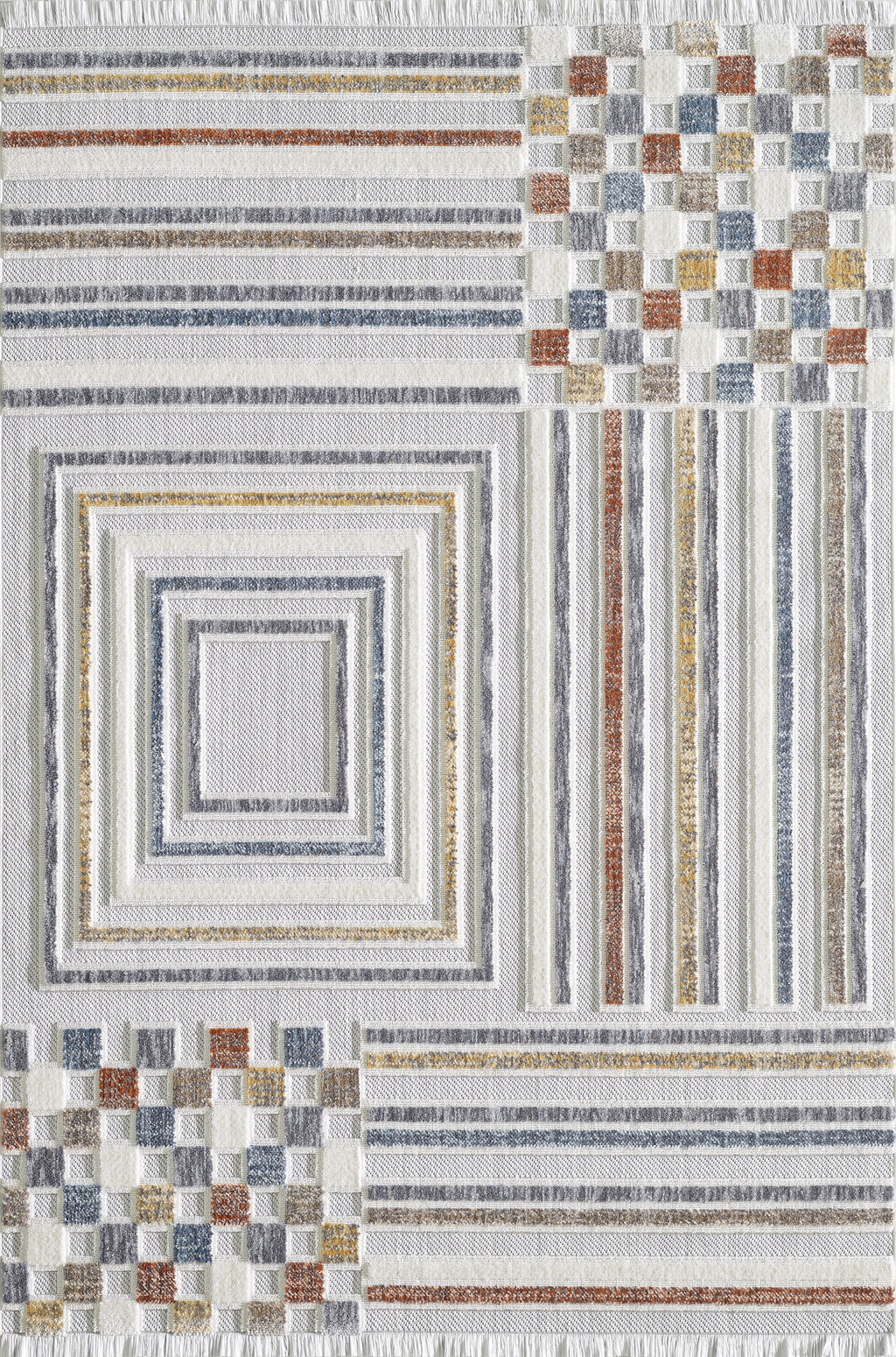 No detail has been spared in the creation of this rug. The abstract pattern has been carved throughout the rug, giving depth and texture to the pattern. The cool use to modern colours has been integrated within each colour block. There are patterns within patterns in this unique piece and it has been finished with a modern short fringe at each end. It is soft to the touch and the different levels of design can be felt along the rug. It has been carefully piped at each edge to edge leaving a tidy finish to an already stunning modern rug.