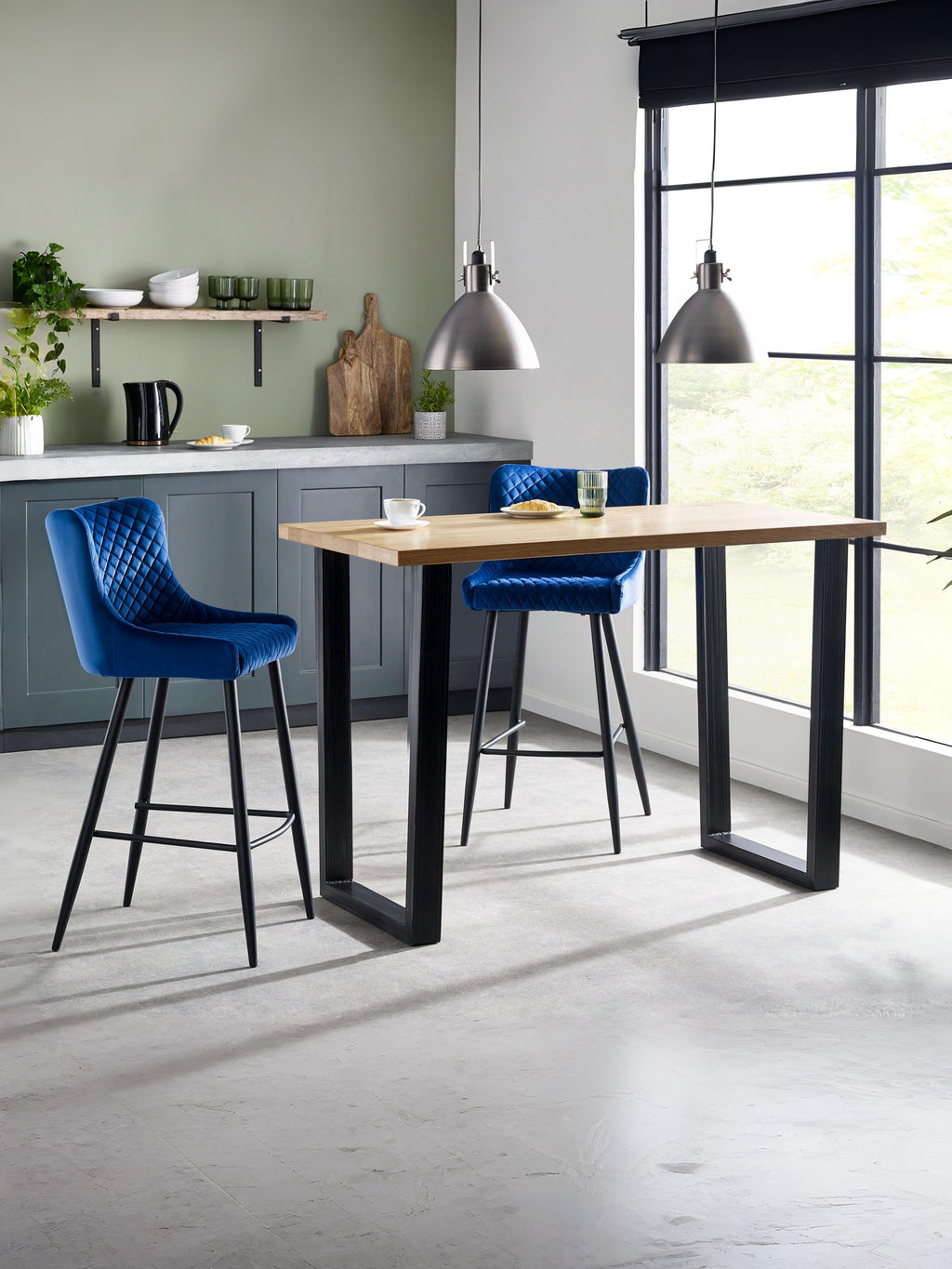 Made from solid oak, this bar table offers a rustic finish emphasising the oak wood grain. The Brooklyn Bar Table offers a vintage edge featuring industrial trapeze style metal legs. Perfectly pair with our wide range of beautiful upholstered bar stools.