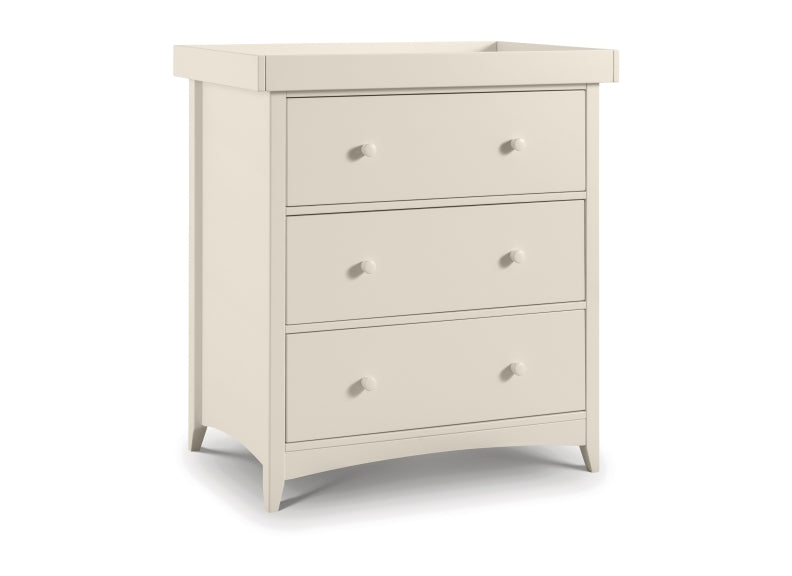 The Cameo Stone Stone White(off-white) Changing Station(with barrier surround), this pine wood off-white lacquered item can be matched with the Cameo Cot Bed & other Cameo Stone White Bedroom items.