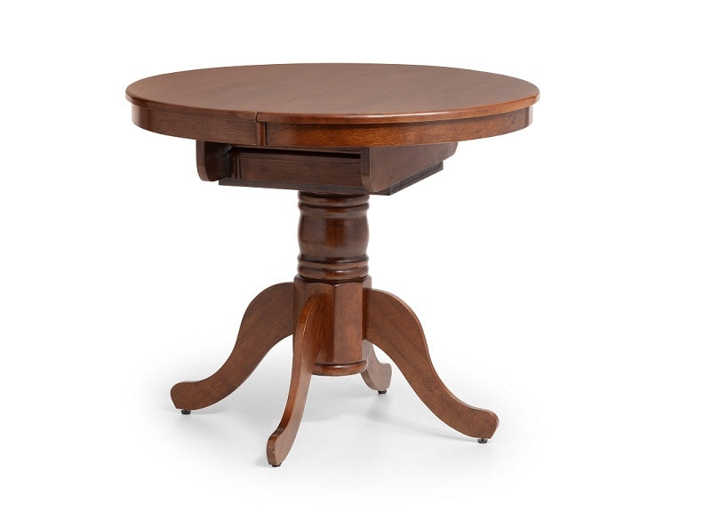 This Canterbury Dark Wood Table has a traditional design with a classic pedestal base, bringing elegance to any room. Made from solid Malaysian hardwood and MDF with a mahogany finish, this practical space saving round dining table extends to an oval table which can fit six people with an easy-to-use butterfly extension mechanism.
