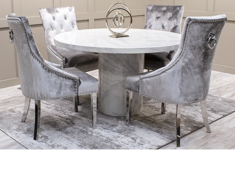 The Carra Round Marble Dining Table can be used with the Belvedere Dining Chairs to make a luxurious dining set