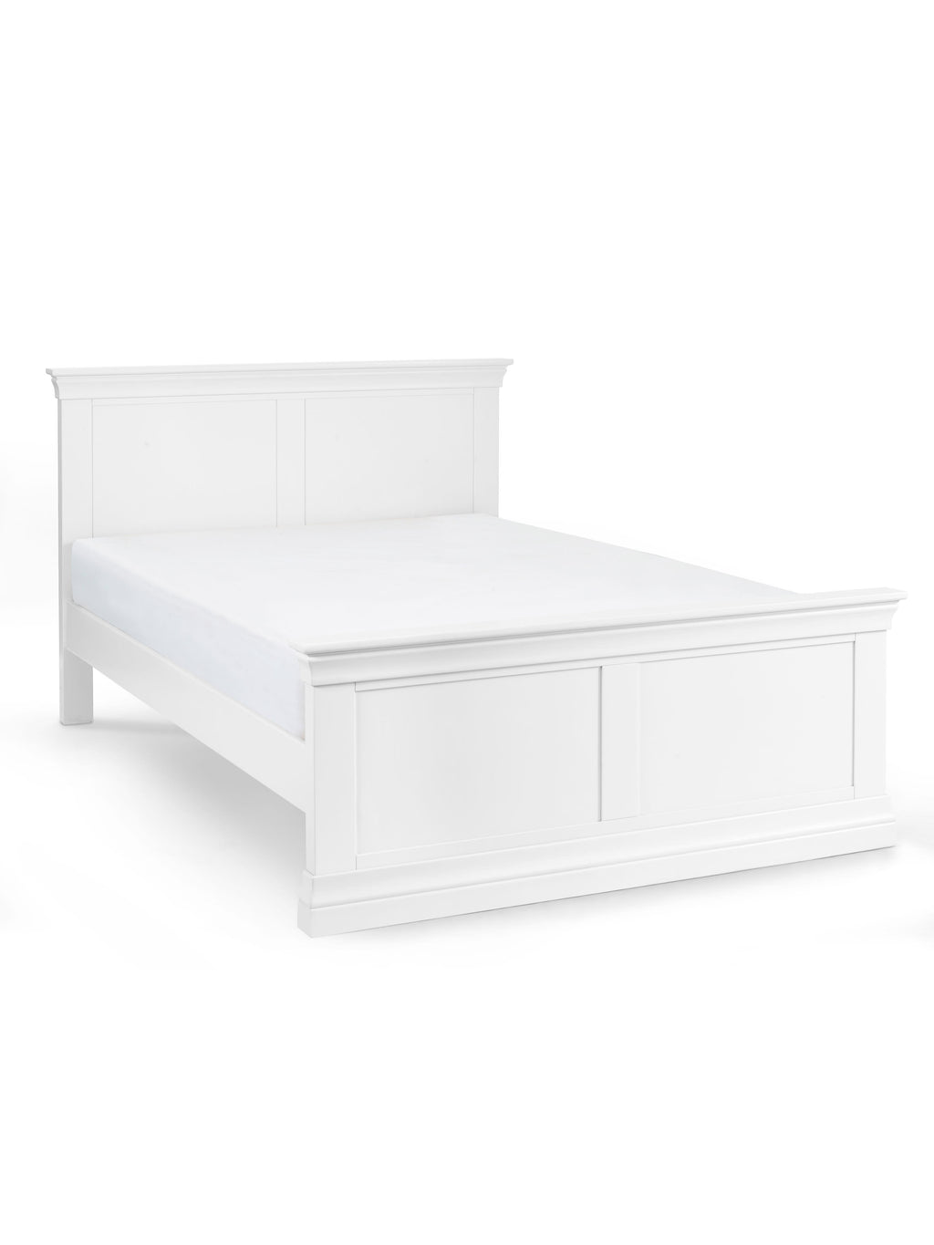 Add a touch of French elegance to your bedroom with the Clermont Bed in Surf White. This beautiful bed is crafted from a blend of pine and MDF, offering a combination of style and durability that stands the test of time. The sleek surf white finish brightens up any room, while solid pine slats ensure robust support for a restful night's sleep. Charming details like top tapered cornices and a distinctive cut-out plinth base gives this bed a sophisticated edge. Its timeless design is a perfect fit for both modern and traditional homes. Mattress sold separately.