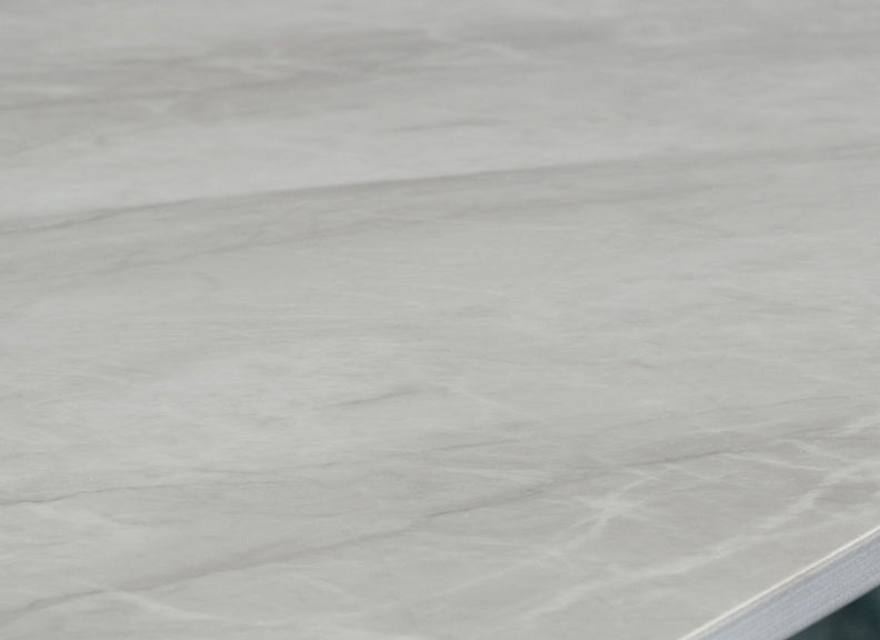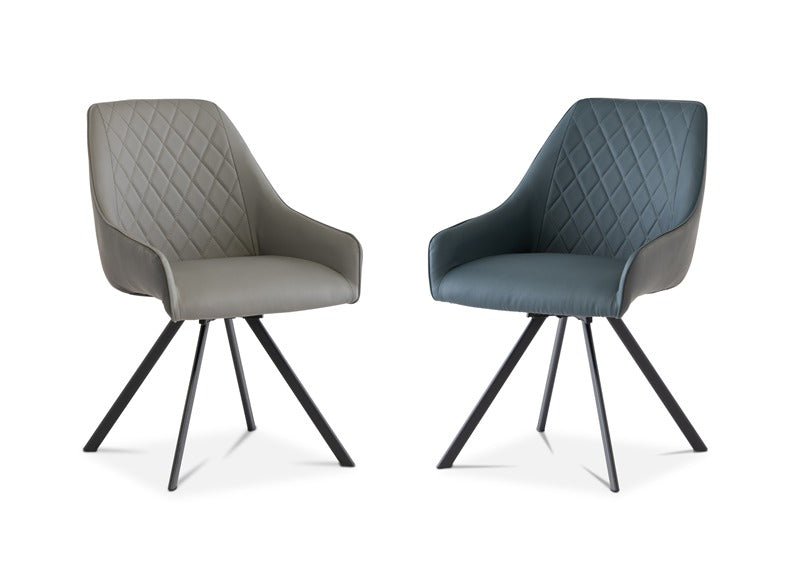 The Cora Fixed Dining Tables have black metal frames with stone effect tops in grey stone effect or white stone effect with unusual gold effect veining. The included four Seville Faux Leather Chairs have a PU faux leather holstery with dark grey backs with grey or blue PU fronts and a manual swivel funcion.