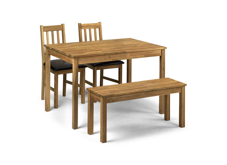 The Coxmoor Rectangular Fixed Dining Table, with matching Coxmoor Padded Seat Dining Chairs And/Or Coxmoor Dining Benches, each are made from solid American white oak/oak veneers with an oiled finish.