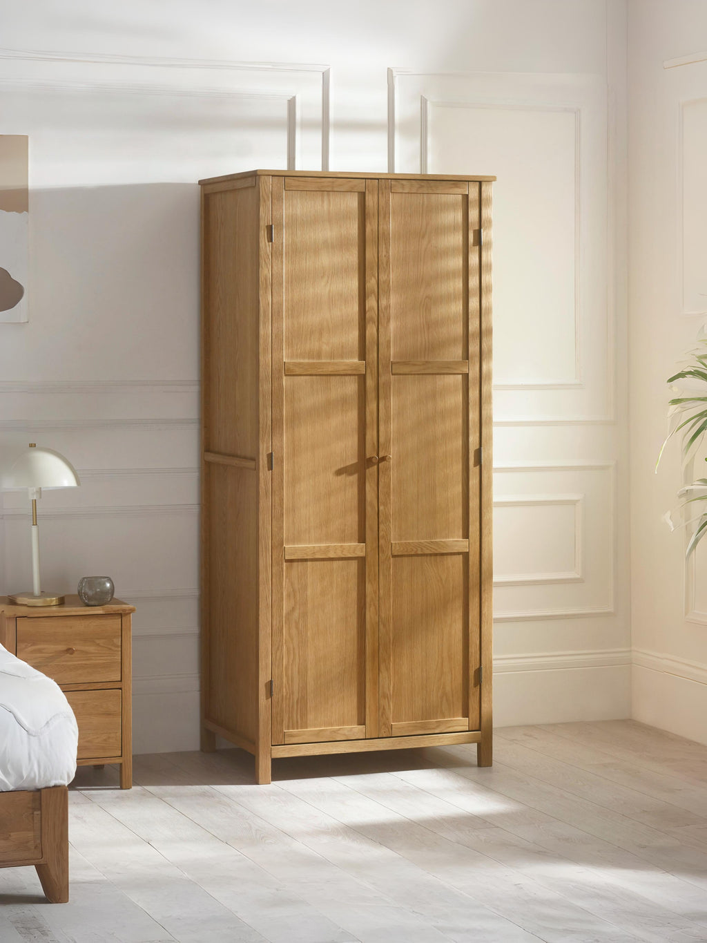 Enhance your bedroom with the Coxmoor Wardrobe in oak, a sophisticated storage solution that combines style and practicality. Crafted with clean lines and a classic oak finish, this wardrobe offers ample hanging space for clothes, along with a convenient shelf for folded items or accessories. The sleek design, complemented by elegant knob handles, allows it to fit seamlessly into any bedroom, while the natural wood grain adds warmth and character to your space. Simple assembly makes it easy to set up.