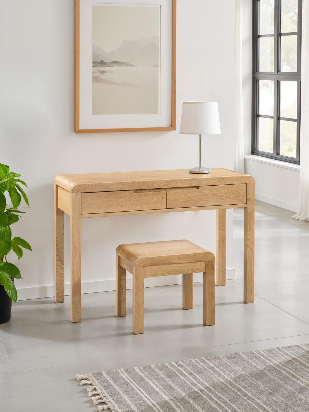 Crafted from solid white oak and oak veneers, the Curve combines clean lines with a gentle curved edging, adding a stunning touch to any bedroom. Recessed handles enable easy opening and a modern feel. This Curve dressing table features 2 drawers, perfect for extra storage for your morning routine. Accompanied by the curve stool. Part of the extensive Curve bedroom range from Julian Bowen