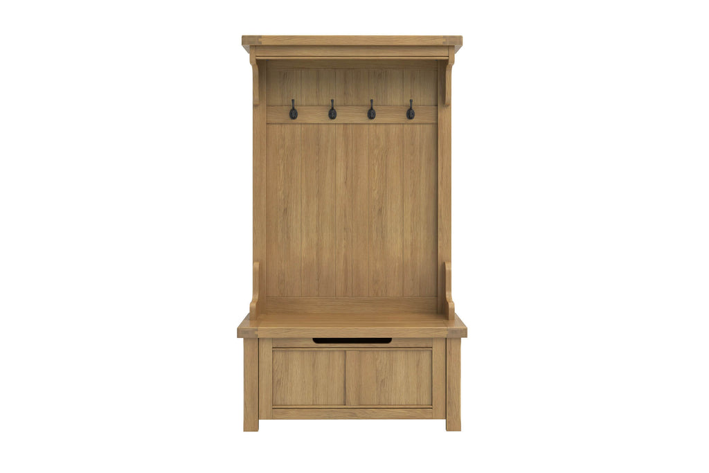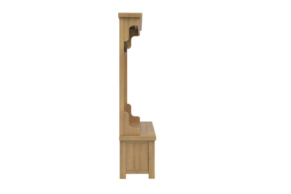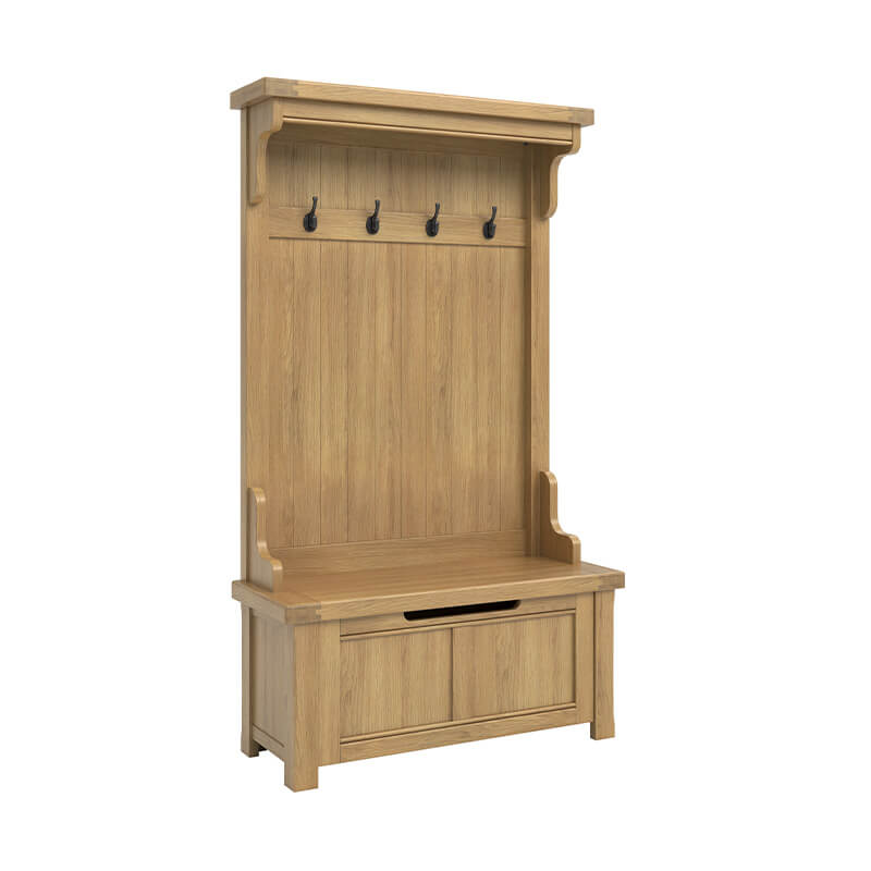 Delaney Hall Stand in Oak offers classic style and everyday practicality for your entryway. Crafted with a solid wooden frame, it features ample storage and metal hooks for coats and bags. Its timeless design adds a warm, welcoming touch to any hallway.