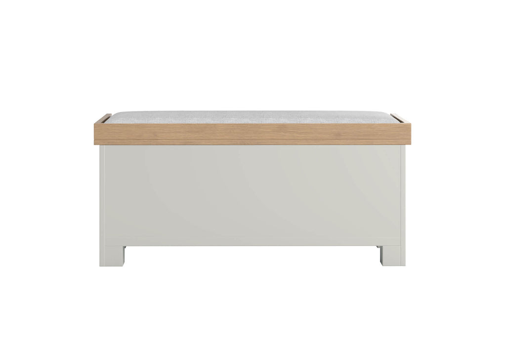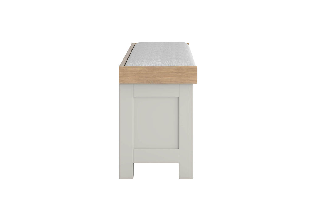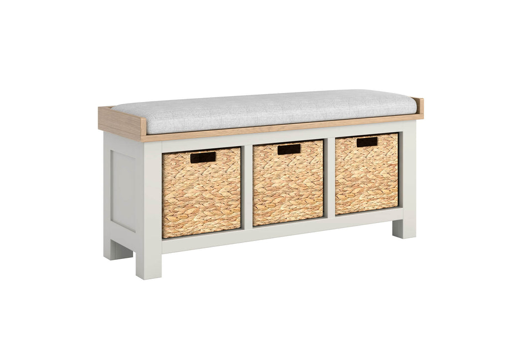 Doune Bench Seat with Fabric Cushion in Grey combines traditional style with everyday practicality. Featuring a two-tone design with a washed oak top and painted finish, it includes cushioned fabric seat pads and woven storage baskets. Perfect for keeping entryways, bedrooms, or utility spaces tidy and inviting.