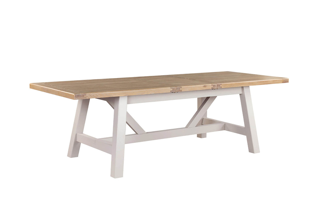 <p>Doune Refectory Extending Dining Table 1900-2350 in Taupe blends timeless design with everyday functionality. Featuring a two-tone look with a washed oak top and painted taupe finish, it includes a central extension leaf to accommodate extra guests with ease. Perfect for both family dining and entertaining.</p>