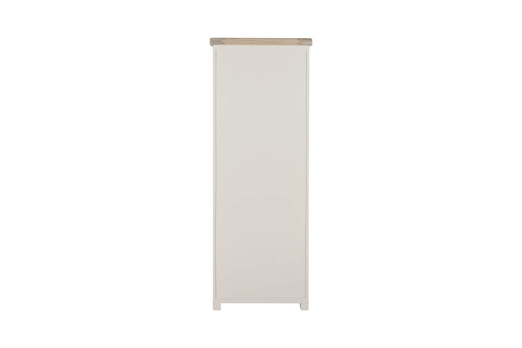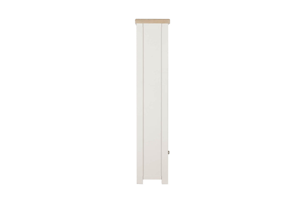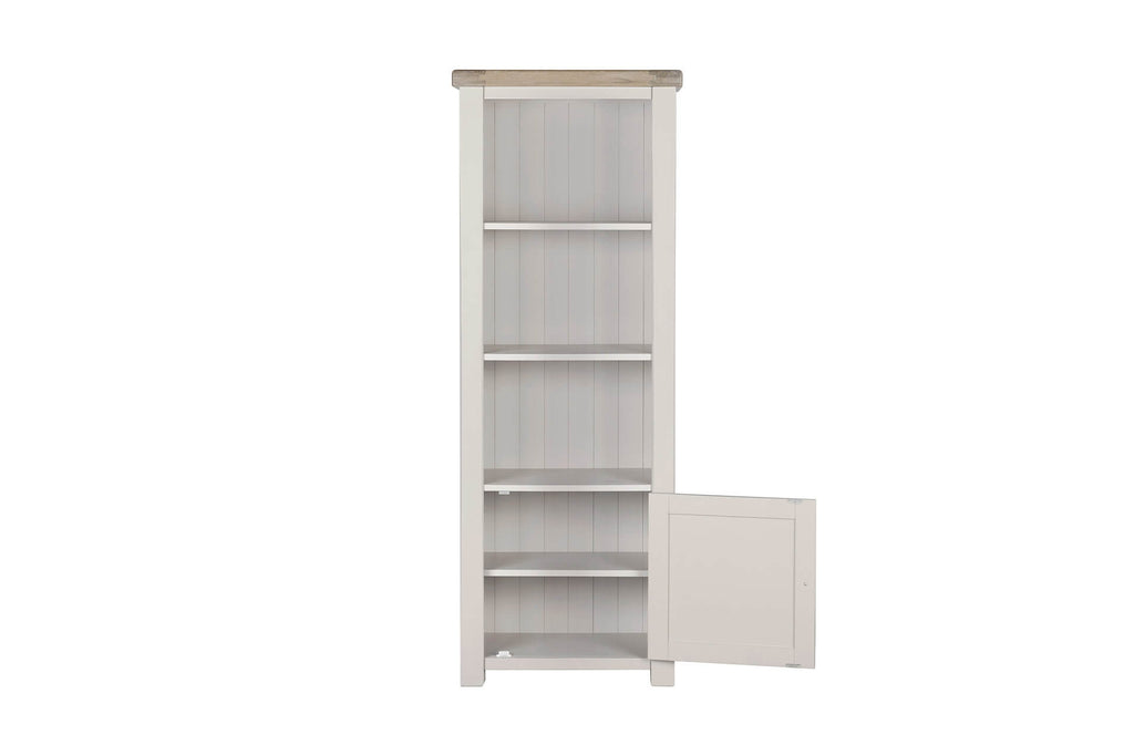 Doune Tall Bookcase in Taupe. This versatile bookcase features a sleek, tall design with a painted finish and a refined oak veneer top. It includes a single cabinet door with a metal handle, offering hidden storage for a clean, organised look. Perfect for any room, the Doune Tall Bookcase combines practical functionality with a sophisticated touch.