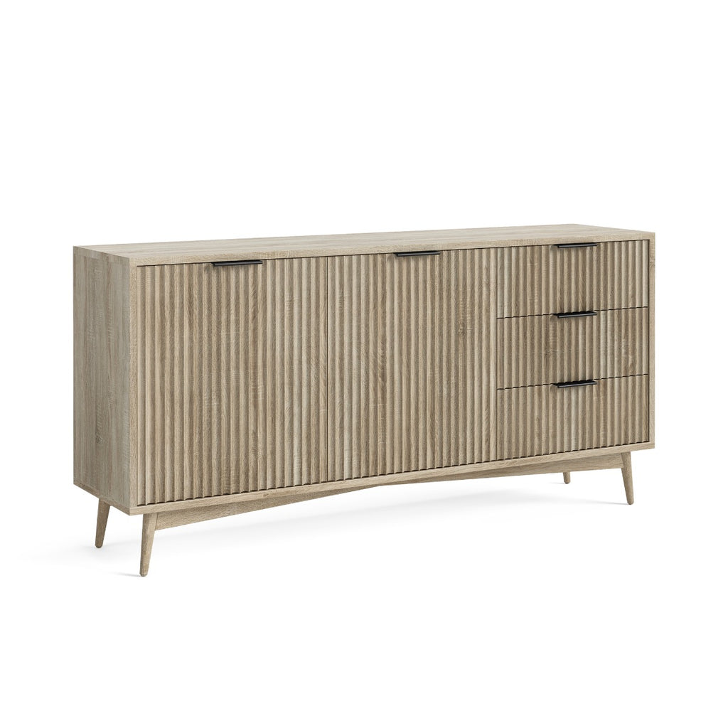 Make a bold statement in your dining or living area with the Enzo Large Sideboard. The contemporary fluted front design, paying homage to the 70s, adds an elegant touch to your home. The natural stain-coated wood, soft wooden leg, and black metal handles contribute to the sideboard's on-trend, statement finish.