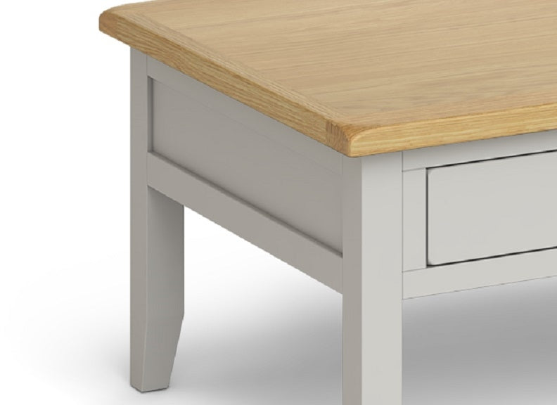 The Guildford Large Coffee Table with storage drawer. An occasional item with oak top and pale grey frame, smaller Guildford Coffee Table also available.