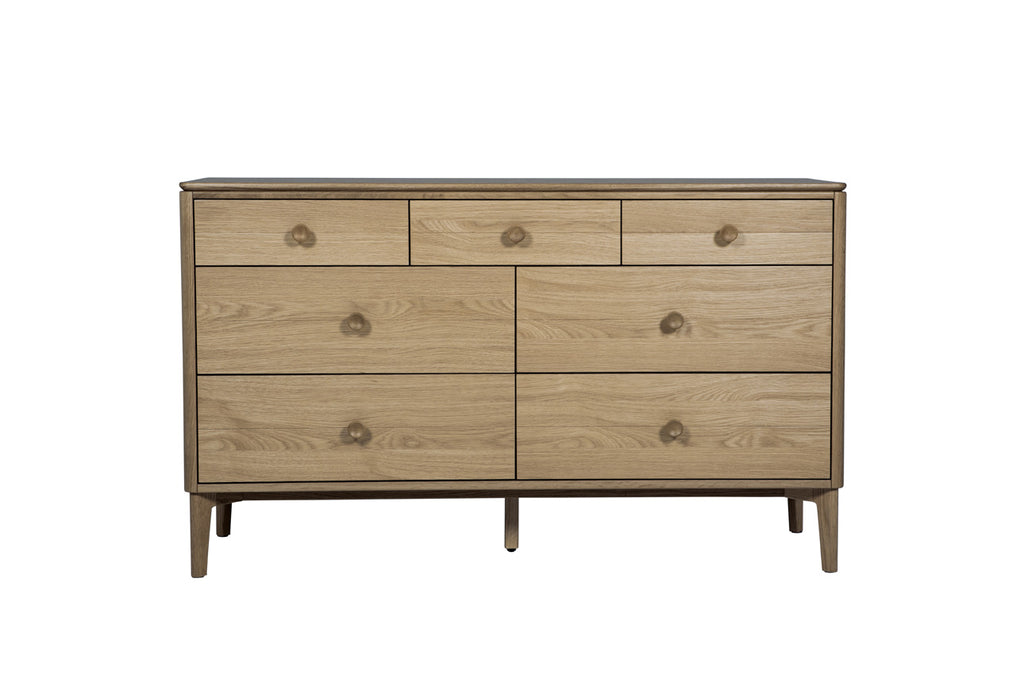 Crafted from oak and oak veneer, the Hadley Wide Chest features curved Scandi style edges for a modern streamlined look. The seven drawers provide ample storage and each drawer is fitted with a smooth soft close mechanism.