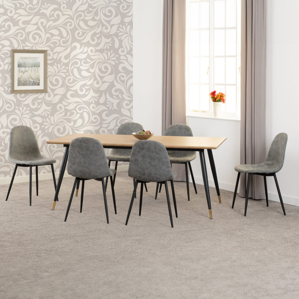 Enhance your dining experience with the stylish and modern Hamilton Large Dining Set with Athens Chairs. This elegant dining set features a spacious medium oak effect table paired with sleek Athens chairs in a contemporary black metal frame and grey faux leather upholstery. The set is designed to comfortably accommodate family gatherings, dinner parties, and everyday meals, offering both aesthetic appeal and durability.