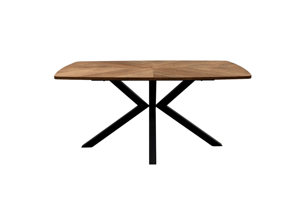 The Medium Oak Veneer 1.6m Dining Table from the Hampton Collection features a hand-designed symmetrical inlay and a warm medium oak finish, adding character to any dining space. Constructed from a combination of oak and elm veneers, this table is supported by a sleek x-frame black powder-coated base, blending simple design with exquisite craftsmanship.