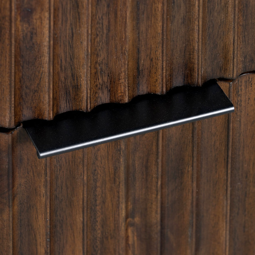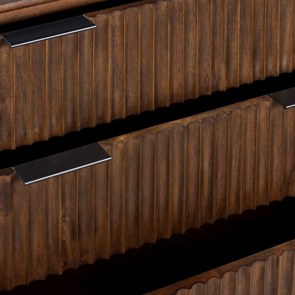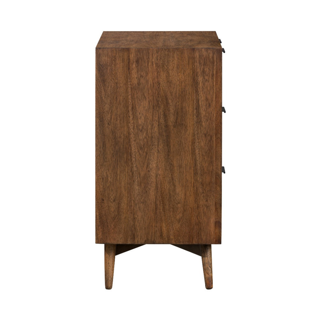 Elevate your bedroom with the Harley 3 Drawer Chest, a fusion of Mid-Century modern aesthetics and Scandinavian design. Crafted from stunning Acacia wood and adorned with black streamline handles, this chest exudes elegance. The warm coffee stain finish not only provides a cozy appearance but also allows the piece to seamlessly integrate into any interior.