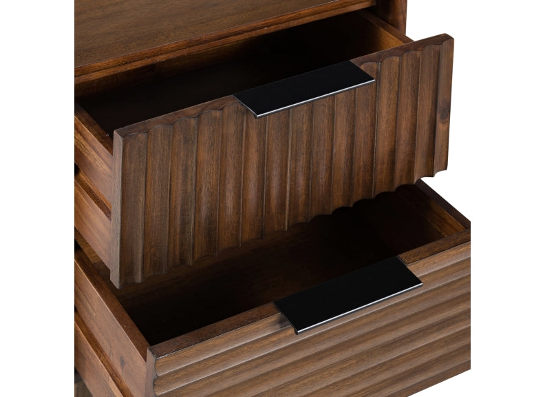 Introduce a touch of Mid-Century modern elegance to your bedroom with the Harley Bedside table. This exquisite piece seamlessly combines the iconic Mid-Century look with a Scandinavian feel, showcasing stunning Acacia wood and featuring sleek black streamline handles. The warm coffee stain finish not only adds charm but also allows this piece to effortlessly transform any interior.