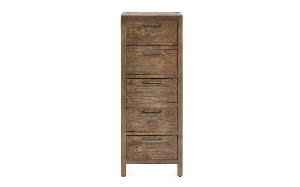 Crafted from reclaimed and recycled wood, this tallboy offers both style and sustainability. Each piece is unique, featuring a distinct distressed finish that adds character and a vintage feel to any room. With five spacious drawers, it provides ample storage while maintaining a compact footprint, making it ideal for smaller spaces or adding extra storage to a larger bedroom.