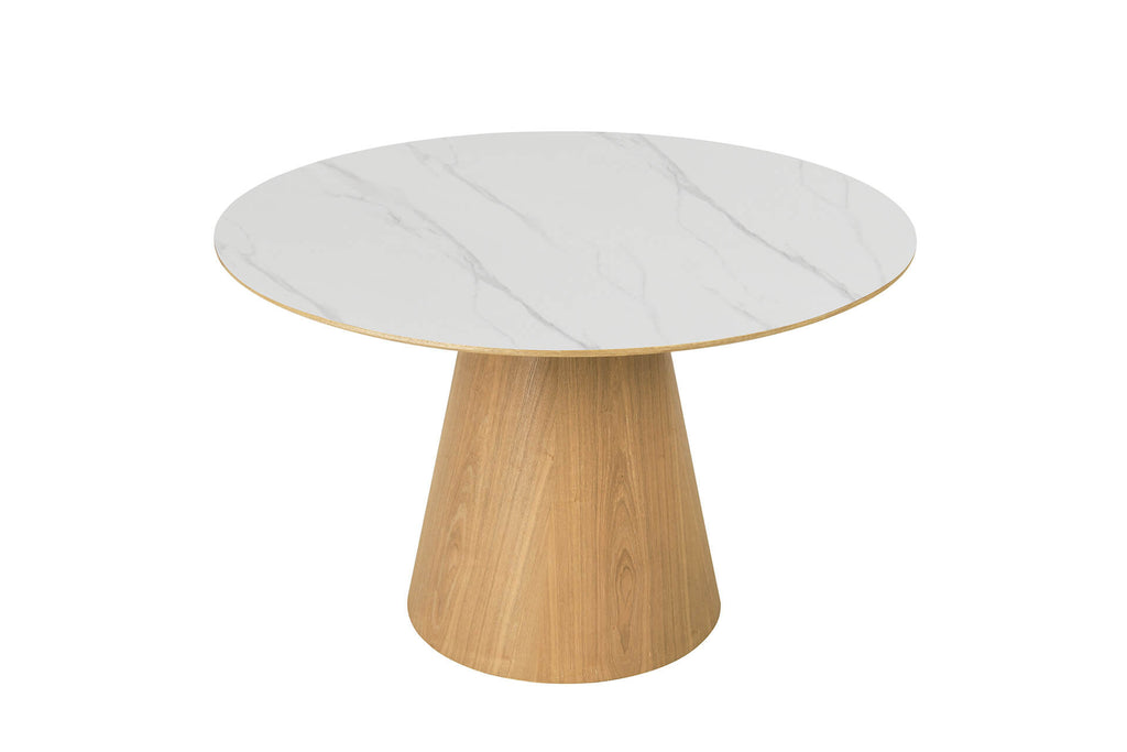 Indy Round Dining Table 1200 in Sand is an ideal choice for both minimalist spaces and family homes, offering everyday strength and durability. Its contemporary design features a stunning marble pattern ceramic top that's not only stylish but also easy to clean, making it perfect for daily use. The sturdy wood veneer base adds a warm, natural touch, ensuring this table blends seamlessly with modern decor.