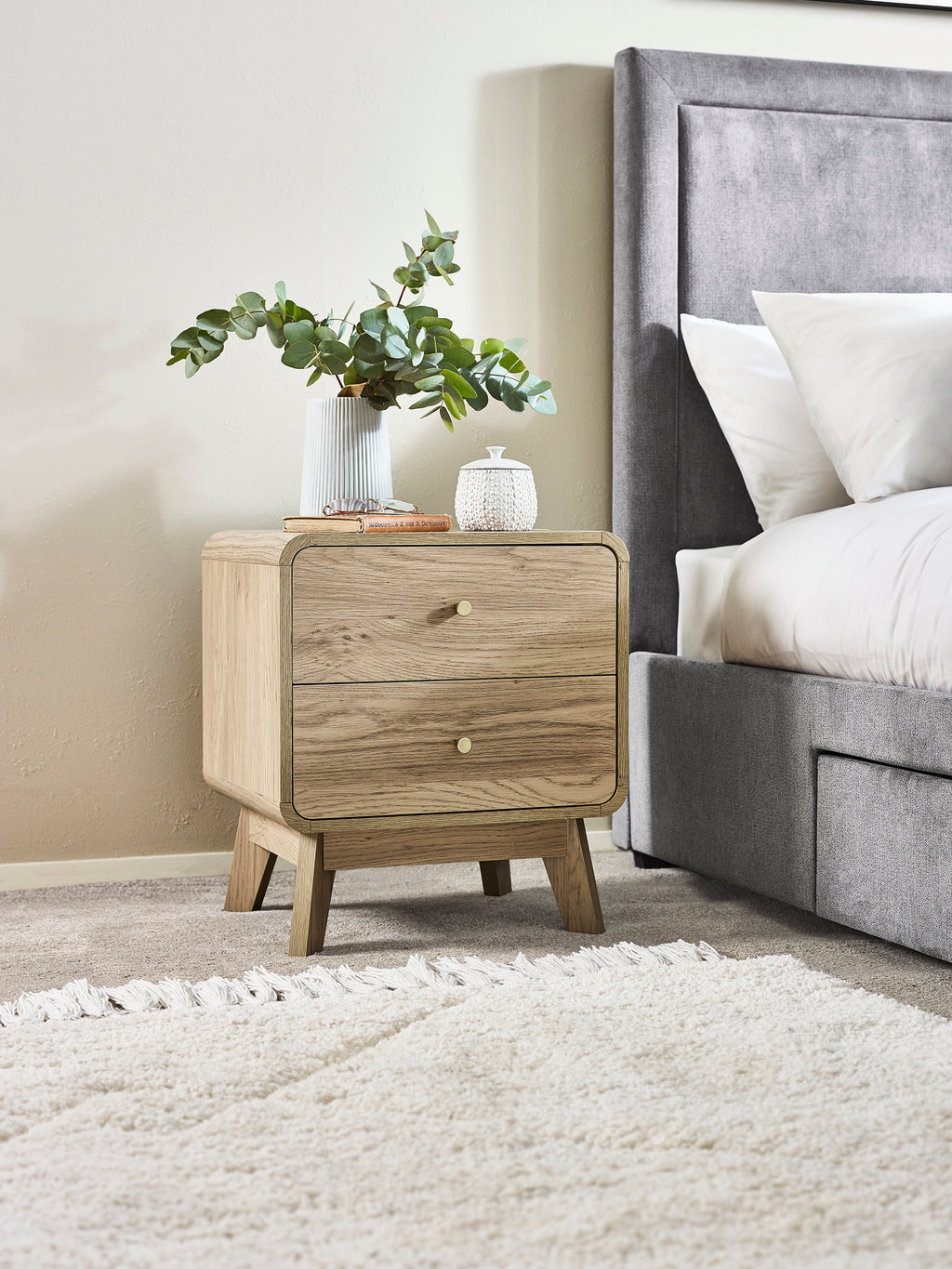 Enhance your bedside with the Ingrid 2 Drawer Bedside, a perfect mix of functionality and elegance. Designed to impress, its warm wood-effect finish showcases beautifully detailed wood grain, adding a touch of natural charm to your space. The gently curved edges and sleek gold-tone handles create an effortless blend of sophistication and modern appeal. With two spacious drawers, you’ll have plenty of room to keep your essentials close at hand while maintaining a clutter-free space. Hassle-free setup means you can enjoy it in no time.