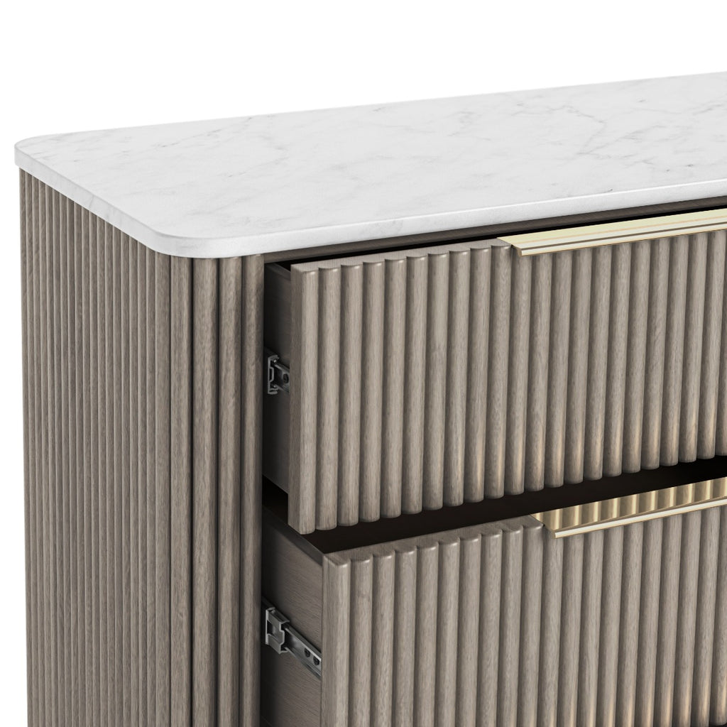 The Isabella Bedroom collection is French inspired, crafted with a painted ivory finish and elegant sculpted details. This beautiful range brings timeless style and practical storage to any bedroom. Isabella Chest 5 Drawer. Dimensions: W900 x H1250 x D400mm. Assembly may be required. Free Nationwide delivery from Homeline Furniture in 2-3 weeks.