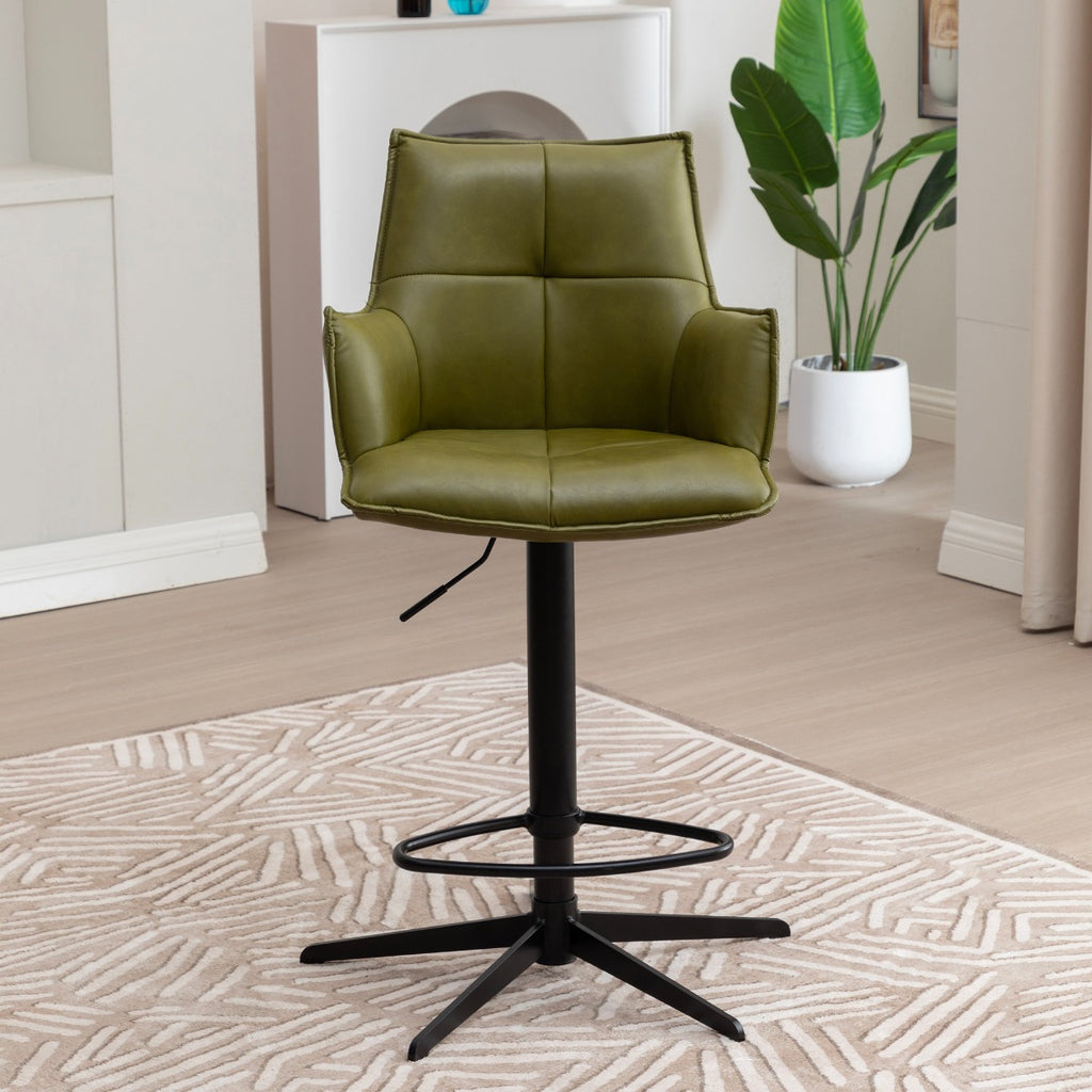 Personalise your space with our Jacob Collection. Offering both bar stools and dining chairs, this range presents a choice between the rich texture of leather match and the cosy feel of full fabric. Select from two stunning colours: a warm, inviting tan or a bold, contemporary green. The Jacob bar stools feature a sleek black metal leg, adjustable gas lift, and auto-return swivel, while the dining chairs offer a stylish swivel seat. Create a cohesive and sophisticated look with the versatile Jacob Collection