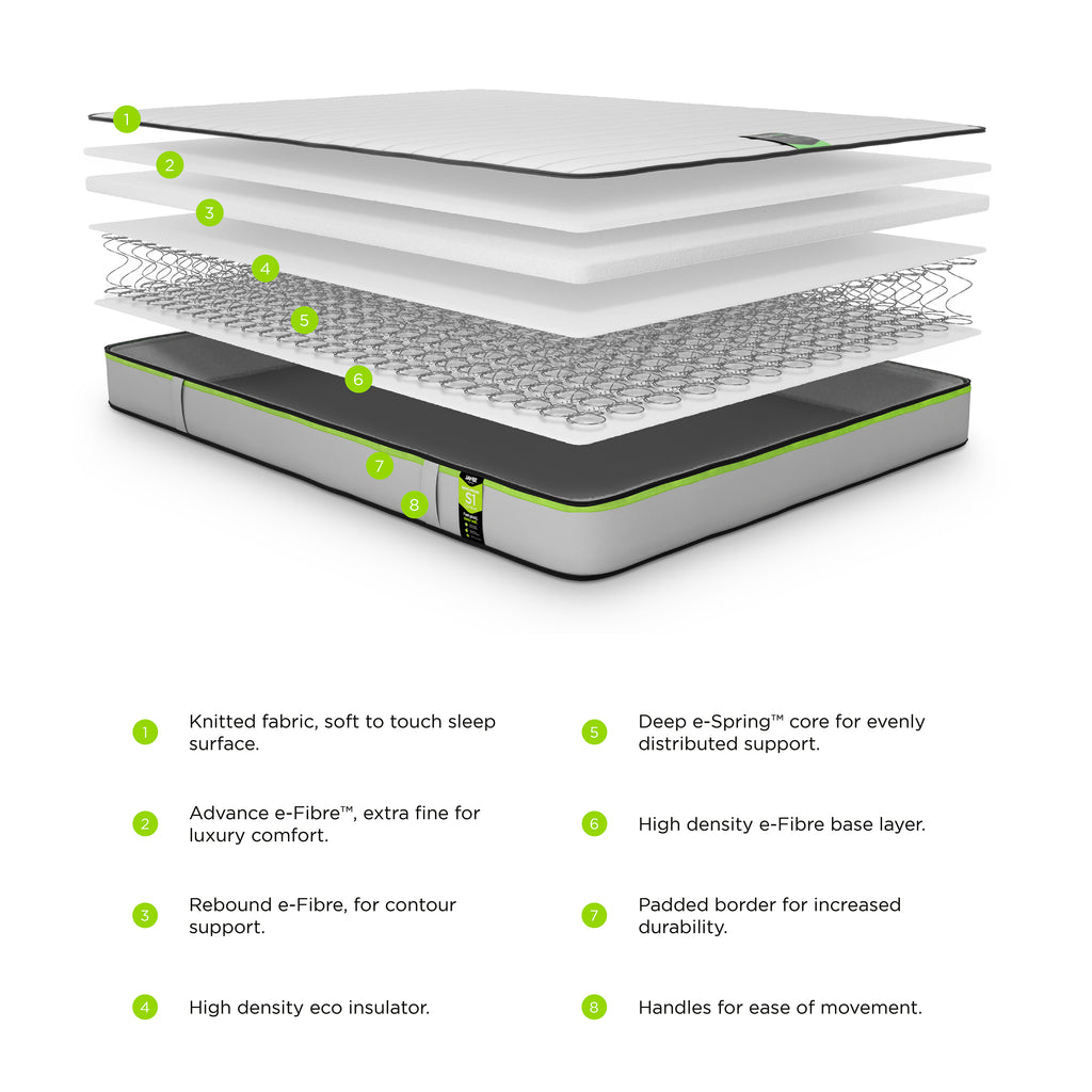 Experience essential support and eco-friendly comfort with the Jay-Be Benchmark S1 Comfort Mattress from Homeline Furniture. Boasting a deep e-Spring core, this mattress is topped with a supportive cushioning layer of Rebound e-Fibre, providing optimal comfort for a restful night's sleep. The addition of super-soft Advancee-Fibre enhances moisture and temperature regulation, ensuring a comfortable sleep environment.