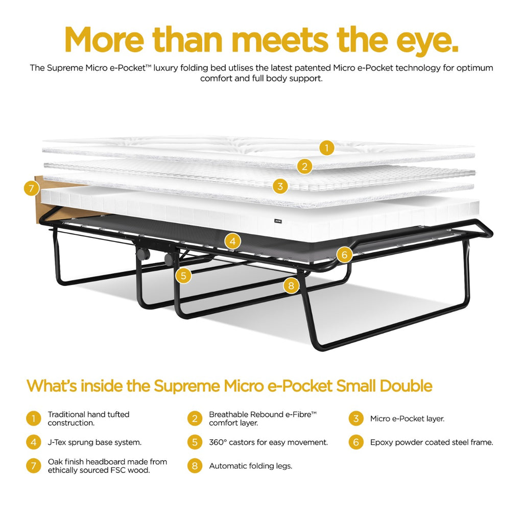 Upgrade your sleeping experience with the Jay-Be Supreme Automatic Folding Bed with Micro e-Pocket Sprung Mattress. With its spacious design, luxurious mattress, and durable construction, it's the perfect choice for those seeking comfort and convenience in a folding bed.