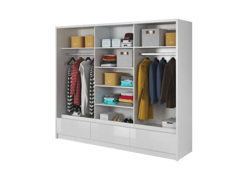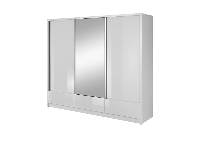 The Lola 2.5 m Slide Robe with three doors(one mirrored), storage drawers, clothes rail and shelving. Ideal bedroom wardrobe for a contemporary styled dwelling.