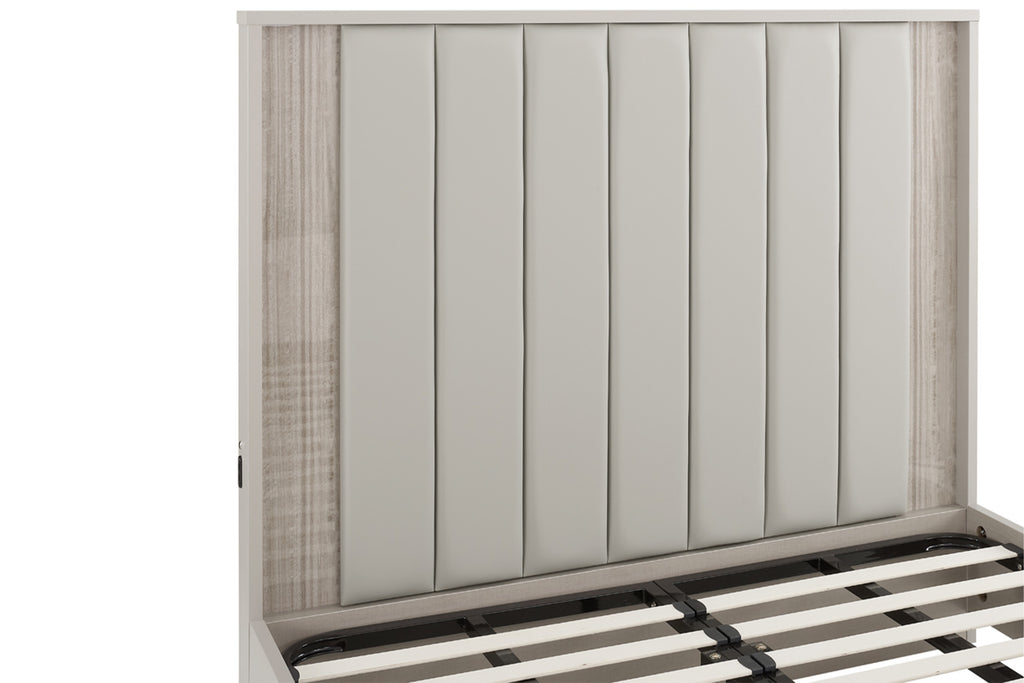 Jules 4'6 Bed in Grey offers a sleek, modern design with a channel tufted headboard for added comfort and style. Featuring a gloss wood effect and contrasting painted colours, this bed exudes contemporary elegance. Equipped with LED lights for a touch of luxury and sprung slats for extra support, it combines both form and function for the perfect bedroom centrepiece.