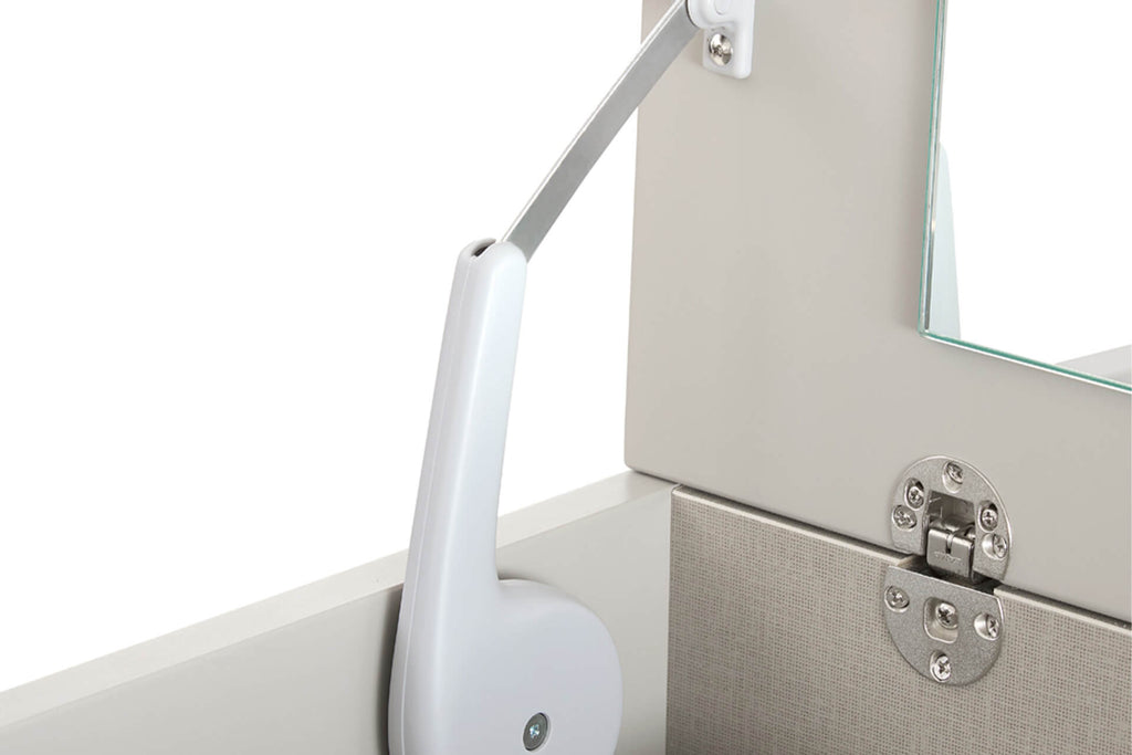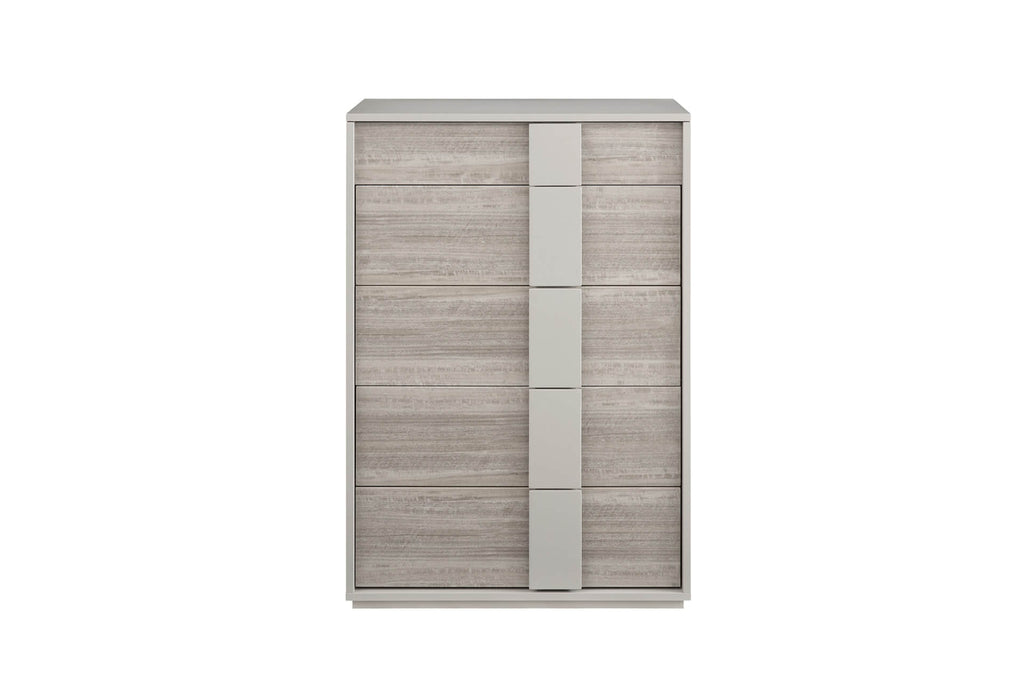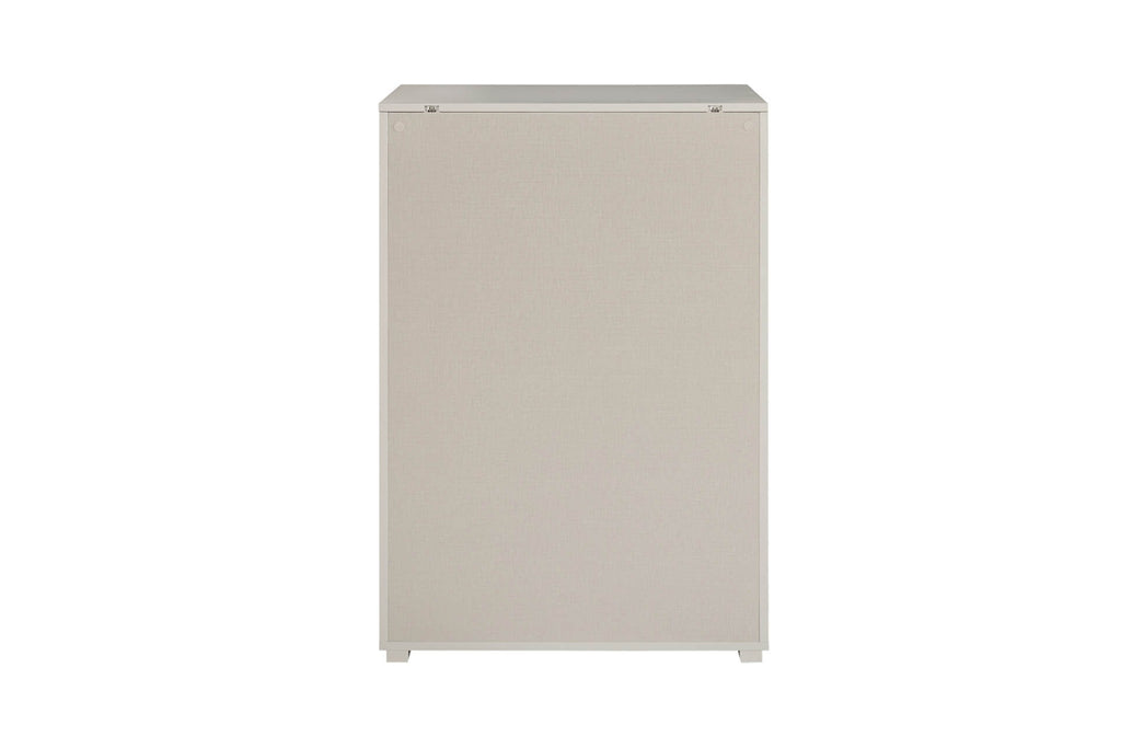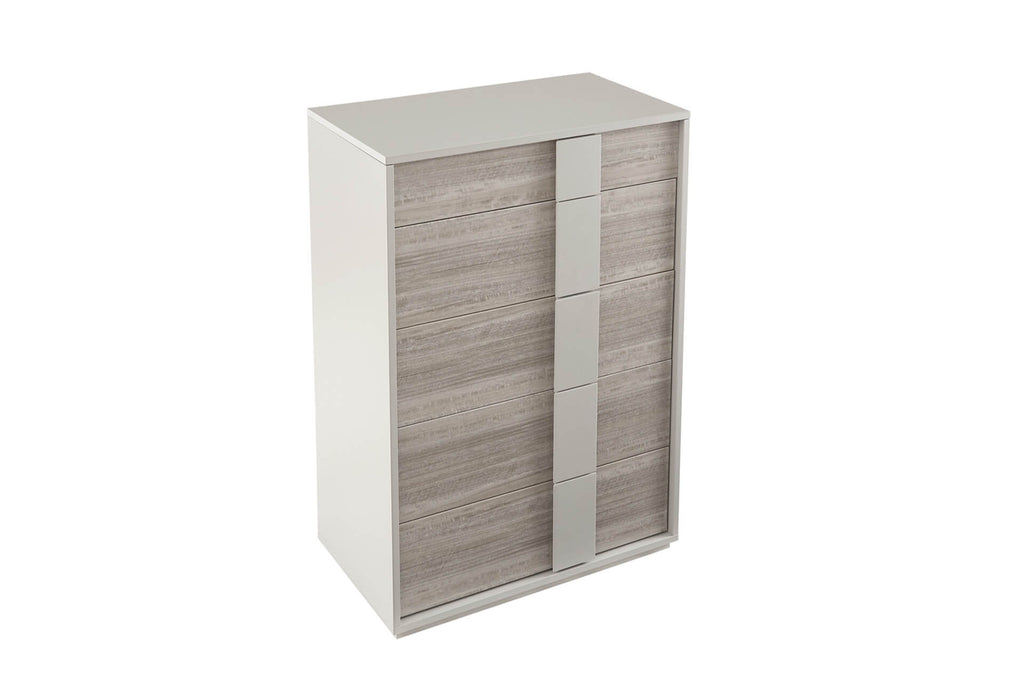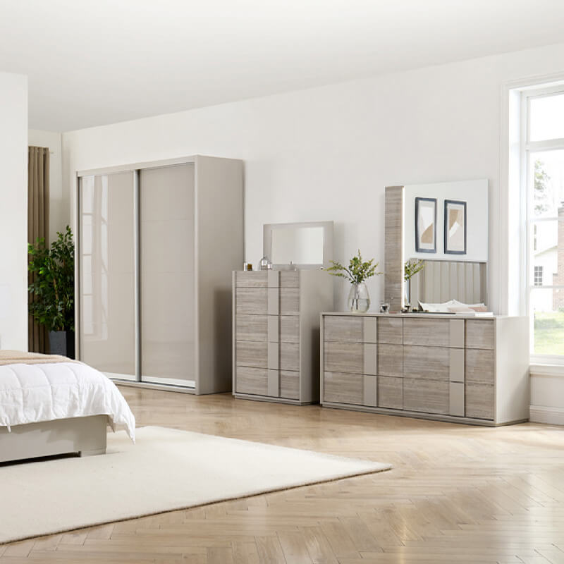 Jules Tall Chest Open Top in Grey is a blend of modern style and practical storage. Featuring a gloss wood effect and matt painted finish with contrasting colours, it adds a sleek touch to any bedroom. The mirrored surface enhances its elegance, while the soft-close mechanism ensures quiet, smooth operation. With four drawers and dedicated jewellery storage, this chest offers both functionality and luxury in one stunning piece.