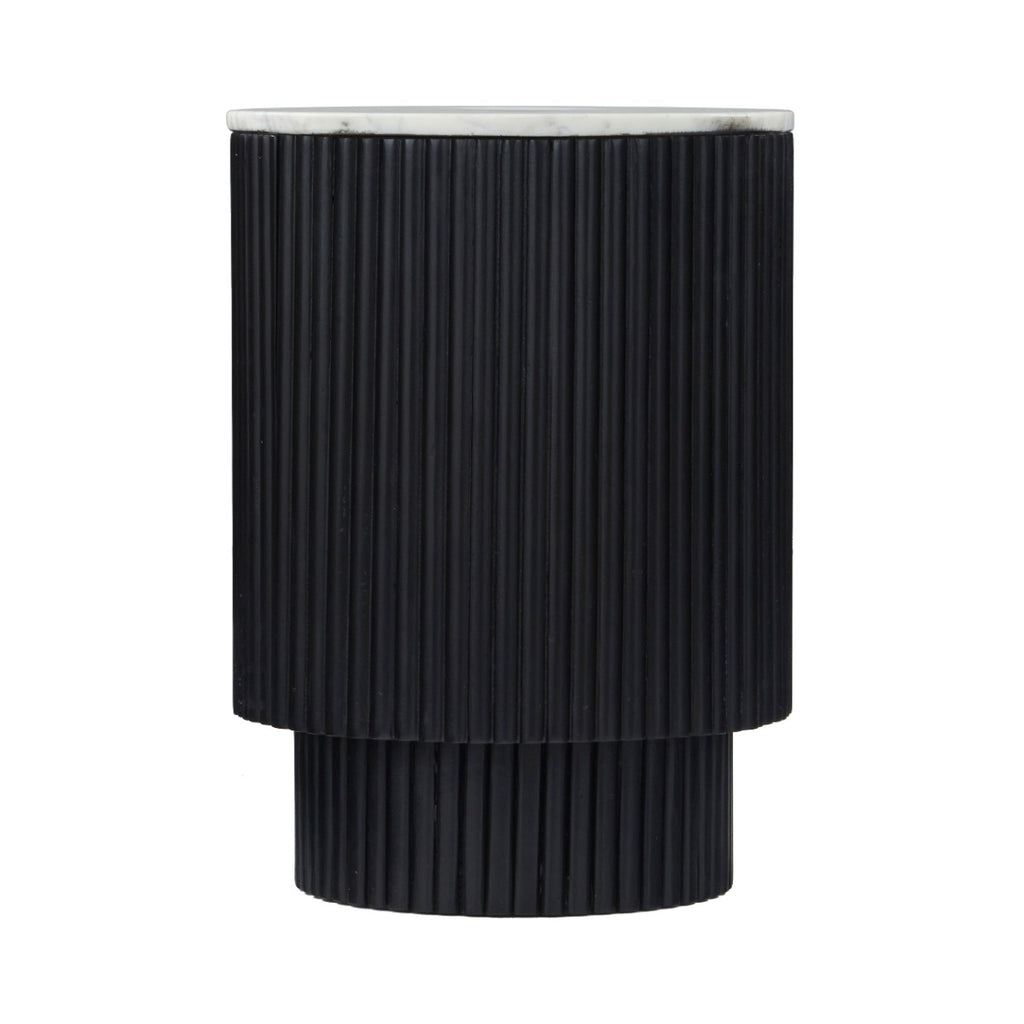 Our Lucas range accentuates its racetrack curves with dynamic ribbing. Multiple finishes provide harmonious contrast, tinting the solid mango charcoal and leaving the marble top a natural hue. A black-finished base elevates the sideboard with round legs to complement the rounded silhouette. A push on the seamlessly integrated doors opens to inner storage to shelves.