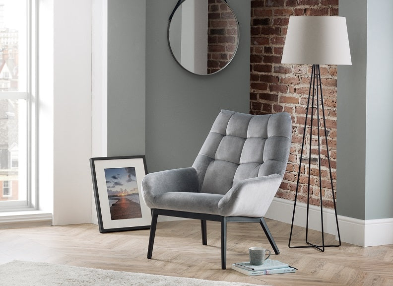 The Lucerne Occasional Chair - with grey velvet buttonback upholstery and a 1970's retro design style, comfort inducing deep padding and black metal supporting frame, the Lucerne Chair is the ideal relaxation chair after a hard day at work.