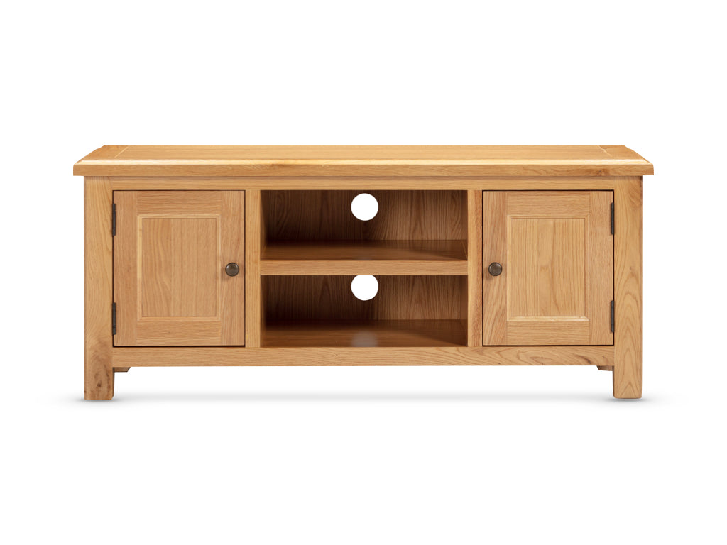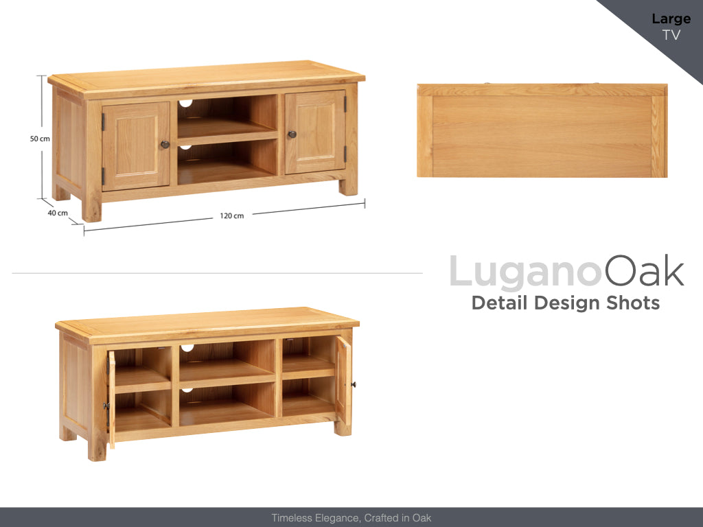 Discover the timeless elegance of our new oak dining and cabinet range. Crafted from solid oak and selected oak veneer, and adorned with brass cup handles, the Lugano Oak collection exemplifies sophistication and style. With clean lines that exude modern simplicity, our range includes both a 140cm and 120cm butterfly extension dining table matched with oak slatted dining chairs. Complement your dining table with our carefully curated selection of sideboards and occasional pieces. Our sideboards offer ample storage space for your dining essentials, while their sleek designs add a touch of sophistication to your space. Whether you're looking for a statement piece or a practical addition, our collection has something to suit every taste Dimensions : H 50 X W 40 X L 120CM Delivery in 3-5 weeks from Homeline Furniture. Some assembly may be required.