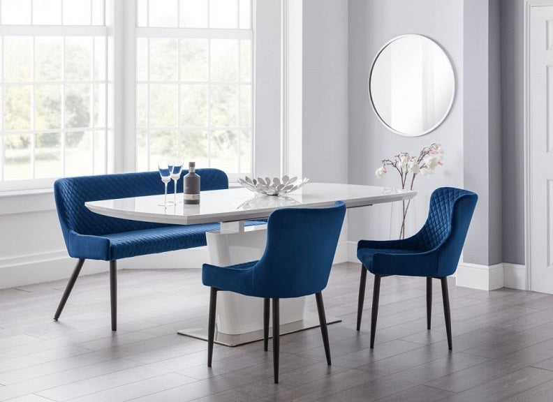 The Luxe Velvet Dining Bench can be ordered in blue, mustard or dark grey velvet upholstery colours(see images for illustration of colour options)-please select your quantity/colour preferences from menus.