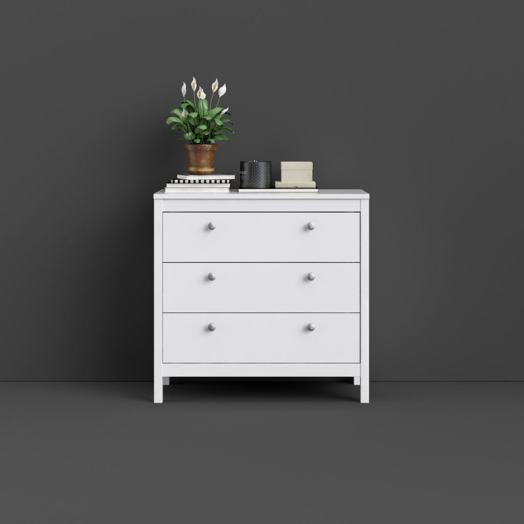 Introducing the Madrid 3 Drawer Chest in White—a timeless addition to your bedroom with a simple, classic, and elegant design. A part of the versatile Madrid collection, this chest features a smooth matt finish and clean linear design, effortlessly blending with any taste.