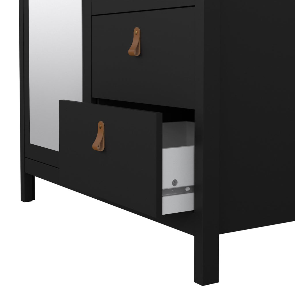 Introducing The Madrid Black 1 Door 1 Mirror 2 Drawer Wardrobe—a timeless addition to your bedroom that effortlessly combines simplicity, classic elegance, and a touch of modern functionality. The Madrid collection, with its smooth matt finish and clean linear design, caters to a range of tastes, providing a versatile and sophisticated storage solution.