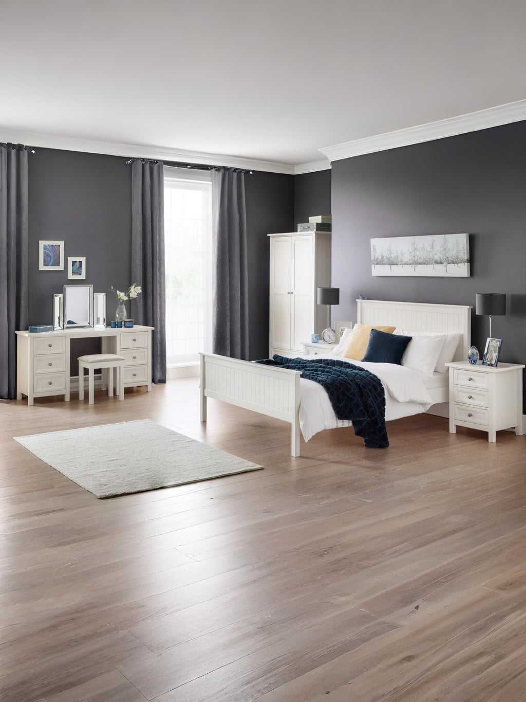 An elegant New England style wardrobe with two doors and one drawer. The combination of exquisite surf white lacquered finish with characteristic side panelling and detailed chamfered cabinetry makes for a soothing and refined aesthetic with timeless appeal, while delicate pewter handles add the perfect finishing touch.