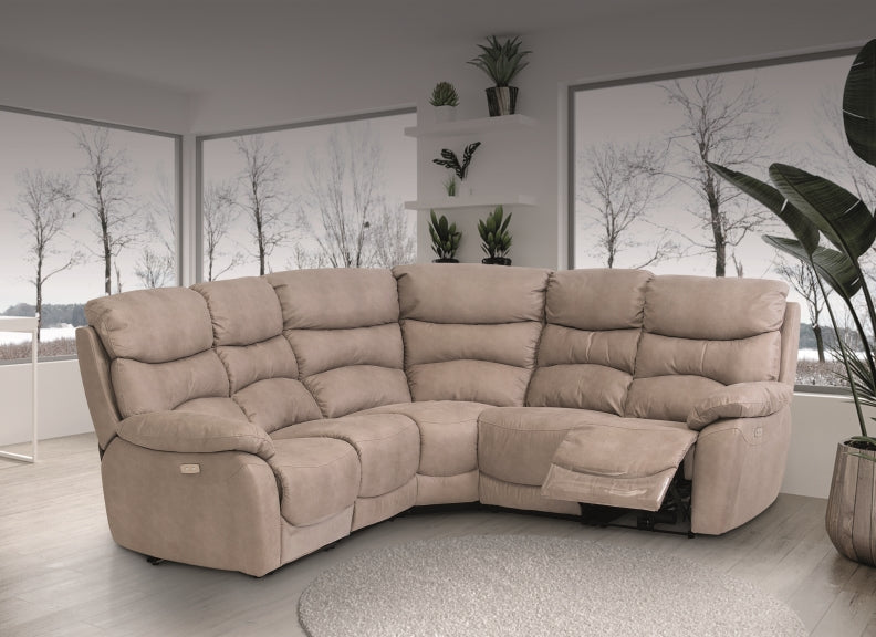 Layla Soft Touch Powered Reclining Corner Sofas are available here in grey or natural fabric colours with or without a drinks console.